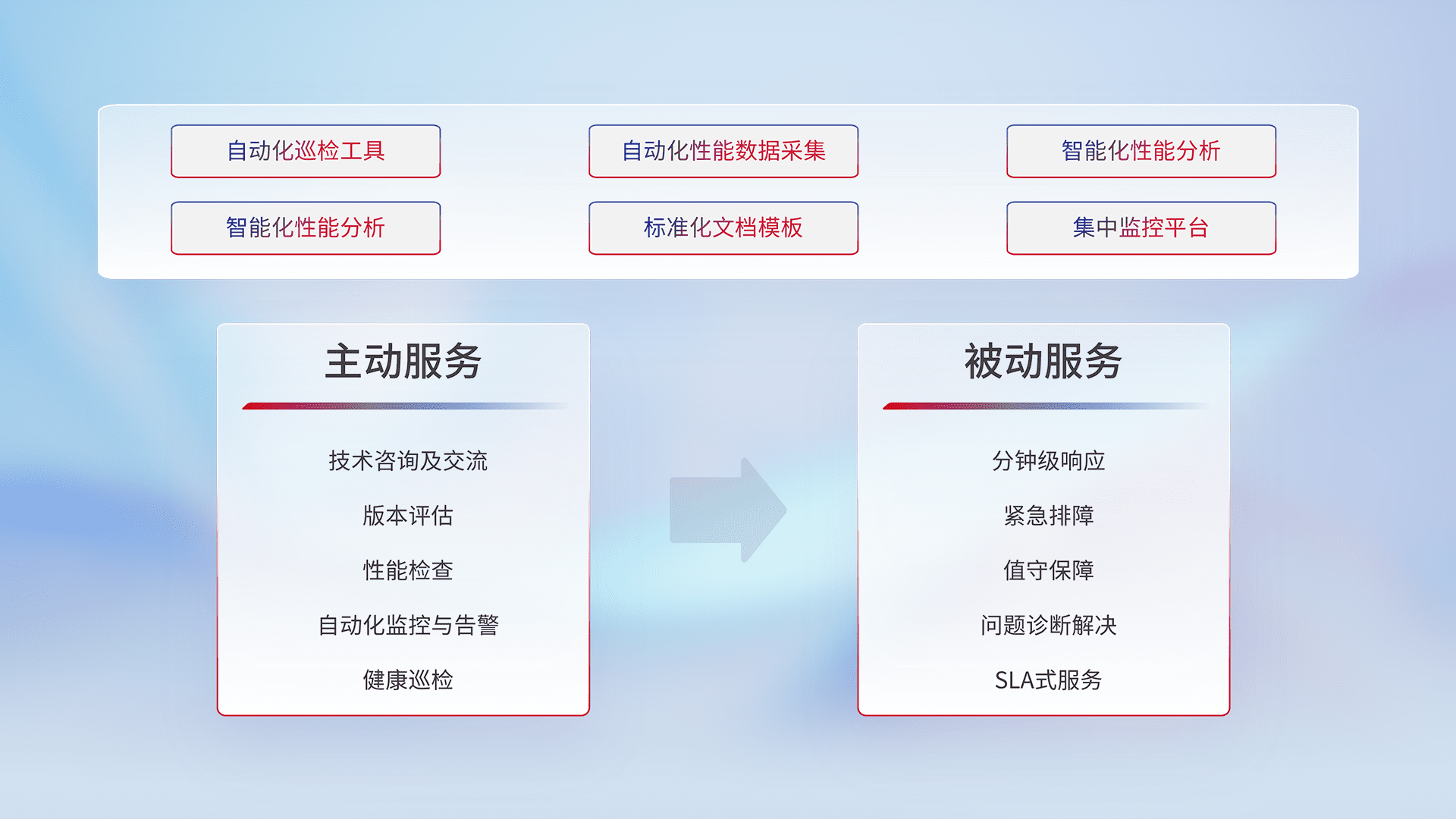 智能化工具和标准化文档,,保障服务质量,,,提供主动服务(包含技术咨询、、、、版本评估、、、、性能检查、、、、自动化监控与告警、、健康巡检)和被动服务包含(分钟级响应、、、、紧急排障、、、、值守保障、、、问题诊断解决、、、SLA服务)。。。