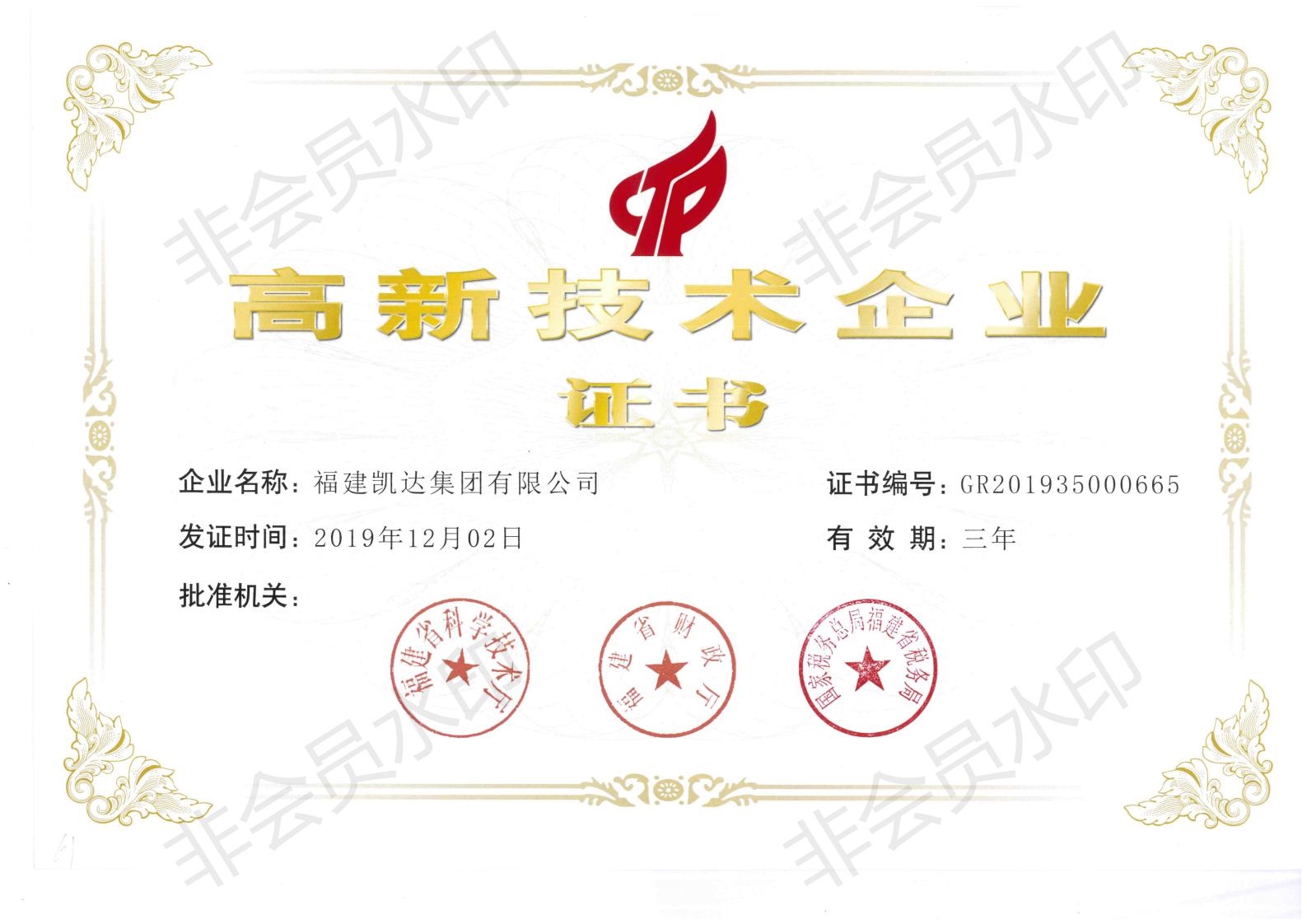 2019年12月 —— 公司荣获“高新技术企业”称号、“福建省高新技术企业培育证书”